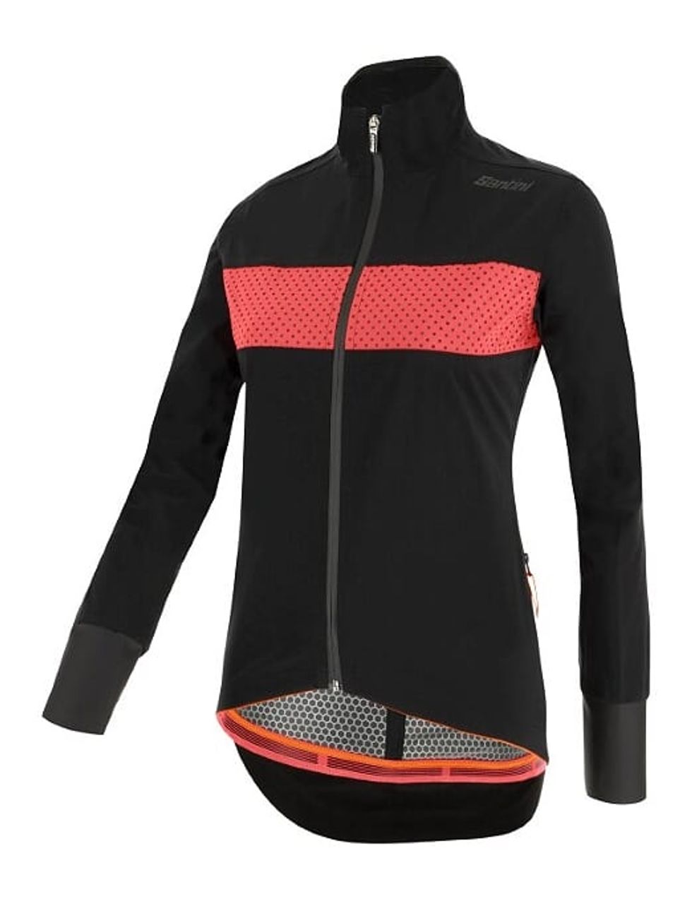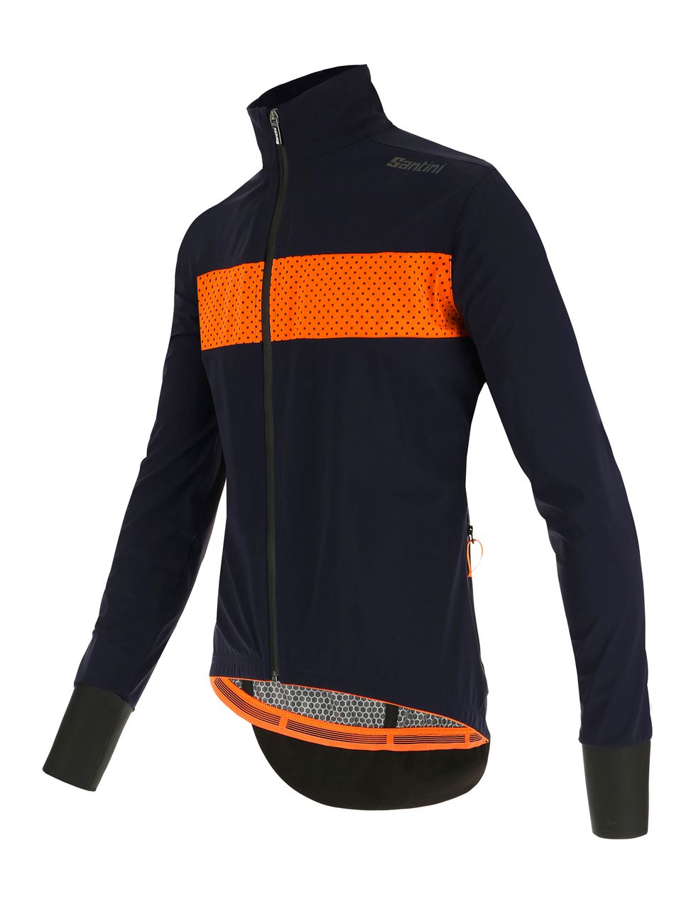 La giacca Guard Mercurio presenta l'area del retro allungata per una maggiore protezione quando si pedala e strisce rifrangenti su petto e schiena e logo Santini riflettente a fondo maglia per una massima visibilità su strada.