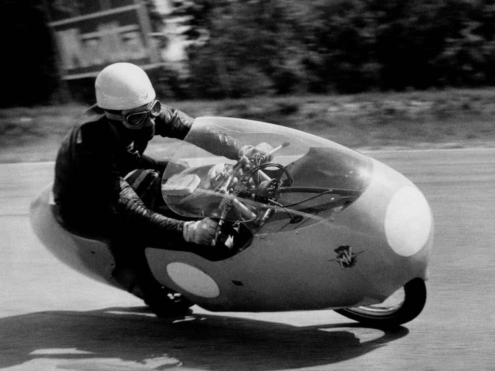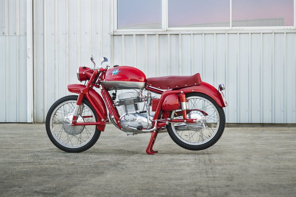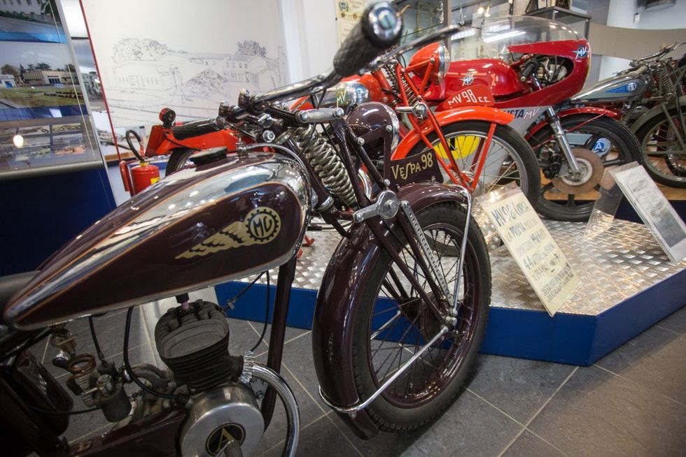 La vera crisi per le officine Agusta si aprì con il secondo dopoguerra, a causa sia dei danni causati dai bombardamenti al distretto aeronautico di Varese sia per gli effetti delle clausole dei trattati di pace, che vietavano all’Italia la produzione di nuovi velivoli militari. La parola «fine» pareva già scritta per un’azienda che era nata e si era sviluppata assieme alla rapida crescita dell’aviazione militare italiana. Furono le idee legate alla riconversione industriale postbellica a fare da ponte tra un’era e la successiva per l’azienda di Cascina Costa. Da una parte l’Agusta rispose come fecero altre aziende del distretto quali la Aermacchi, alla crescente richiesta nazionale di motoleggere, prima forma di motorizzazione di massa del dopoguerra. Già il 12 febbraio 1945, durante gli ultimi drammatici mesi di guerra, Domenico Agusta fondava la Meccanica Verghera, in seguito conosciuta come MV Agusta. L’esordio avvenne con una 98cc. (cilindrata comune a molte motoleggere dell’epoca) che inizialmente fu battezzata «Vespa», nome abbandonato per la diffida di Piaggio che la usò per il suo celebre scooter. La caratteristica di MV Agusta fu il grande peso che le competizioni ebbero sulla nomea del marchio, che divenne sinonimo di qualità e alte prestazioni. La prima produzione si concentrò su piccole cilindrate (125, 250cc) portate più volte in trionfo nei circuiti dei primi anni Cinquanta prima dal pilota Franco Bertoni e quindi dal britannico Leslie Graham che portò a tagliare il traguardo per prima una MV 125 nella sua Inghilterra. L’era delle competizioni del marchio conobbe un crescendo a cavallo tra i decenni Cinquanta e Sessanta con i trionfi prima di Carlo Ubbiali (vincitore nelle classi 125 e 250) e quindi dal 1965 con l’astro nascente di Giacomo Agostini che in sella alle MV Agusta per oltre un decennio fu il dominatore assoluto dei circuiti, con 13 mondiali e 311 vittorie. Nel 1973 Corrado Agusta, successore del fratello Domenico scomparso nel 1971, cedette il comparto motociclette alla parastatale EFIM che nel corso dell’anno decise per il ritiro definitivo dalle corse e per la cessazione dell’attività dopo 260.000 esemplari prodotti nel 1977. Tra i modelli di punta della prima fase del marchio di Cascina Costa quelli degli anni Cinquanta equipaggiati dal monocilindrico da 175cc come la Disco Volante e la 175 CS e CSS. Durante gli anni di massima espansione della produzione furono presentati anche modelli di cilindrata superiore, dalla 600 a sei cilindri alle 500 fino alle iperperformanti 750 (che con una velocità di punta di 220 Km/h si ponevano ai vertici delle prestazioni nel mondo delle prime maximoto). La concorrenza interna, che non fece mai decollare MV nel campo degli scooter dominato da Piaggio e Innocenti, fu progressivamente dominante e rese le motociclette Agusta meno appetibili a causa degli elevati prezzi di listino. La crescente concentrazione nel settore degli elicotteri sancì la fine delle due ruote di Cascina Costa, che vedranno nuovamente la luce nel 1992 quando Giovanni Castiglioni di Cagiva rileverà il marchio storico MV Agusta fino ad una seconda crisi a metà degli anni Duemila. Oggi la MV è rinata grazie alla partecipazione del gruppo russo facente capo all’imprenditore Timur Sardarov, che ha indirizzato la produzione dei nuovi modelli in edizione limitata con prestazioni elevate e richiami al passato glorioso delle competizioni della seconda metà del Novecento.