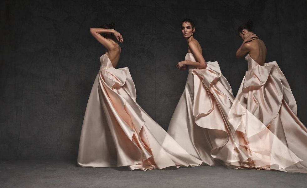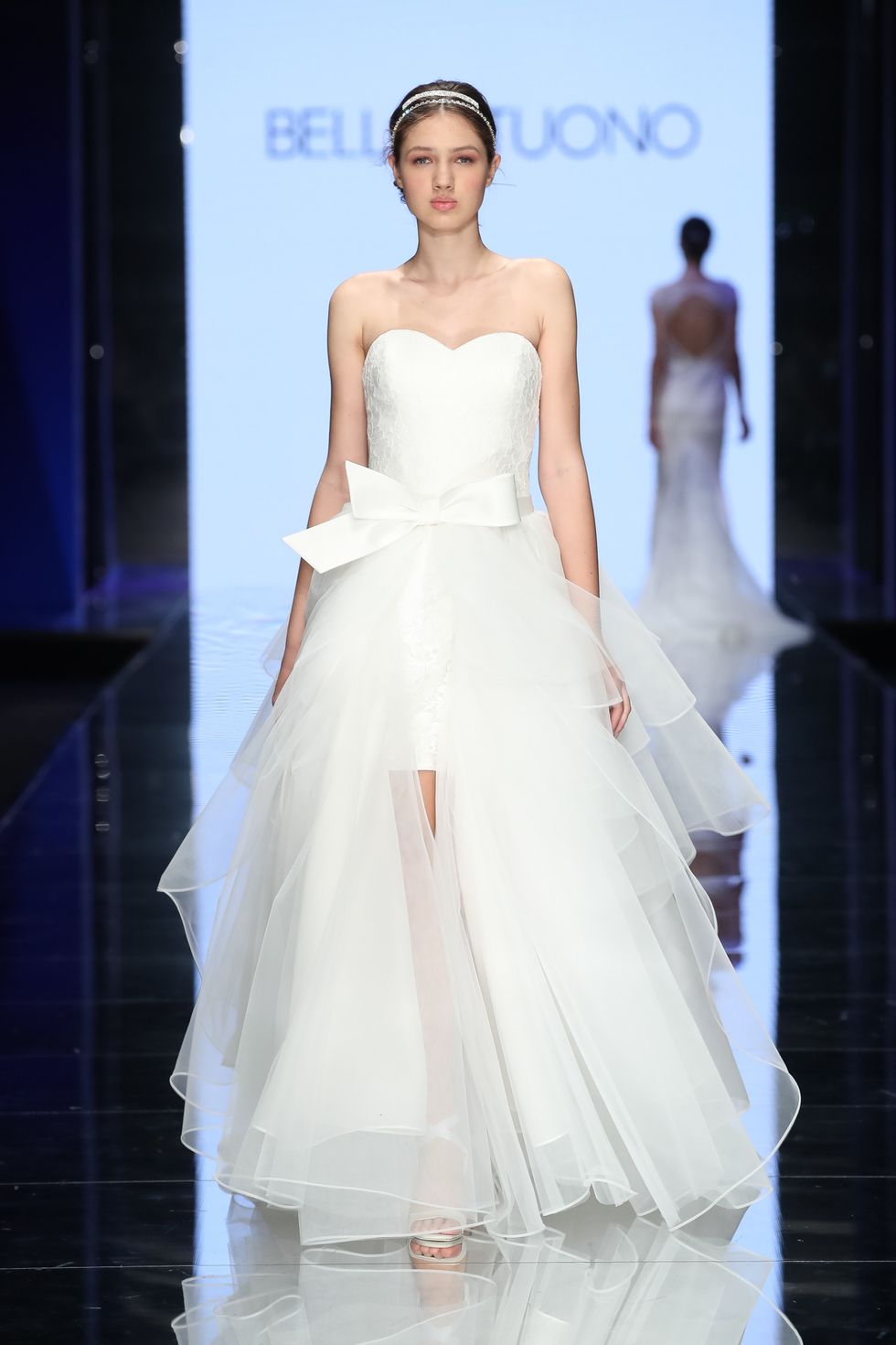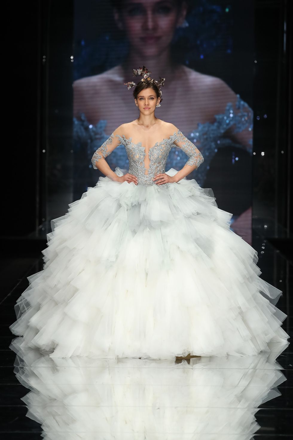 L'abito da sposa sostiene la sua centralità diventando voluminoso, importante, vaporoso, persino ingombrante. Così insegnano le sfilate di alta moda parigine. Complice il tulle che si gonfia in effetti suggestivi, si sovrappone, gioca la leggerezza del plissé. Tulle per il corpetto e tulle per la gonna che, come una nuvola suggestiva punta sul bianco, ma a volte anche sul rosa fino a toccare punti di fucsia.