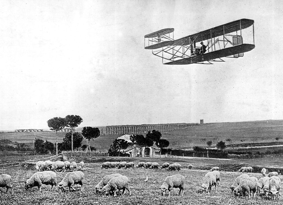 Nell’aprile del 1909 la dolce campagna di Centocelle divenne teatro della nascita dell’aviazione italiana. A tenere il battesimo solenne furono nientemeno che gli inventori del volo a motore, i fratelli Orville e Wilbur Wright, che nel 1903 a Kitty Hawk, North Carolina, portarono felicemente in volo il loro Flyer cambiando il corso della Storia. Meno di sei anni dopo quel primo volo, quella parte di campagna romana dall’aspetto ancora bucolico come quello dipinto dai grand tourers del secolo precedente, diventerà la terra di quel progresso inarrestabile che proiettò il mondo nel «secolo breve».