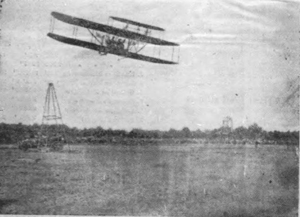 Wilbur comparve poco dopo, il viso ossuto e l’andatura composta. Le cronache raccontano di un personaggio estremamente riservato ma non scortese, totalmente concentrato sugli ultimi controlli effettuati fischiando un’aria della «Vedova allegra». Prese posto ai comandi e il biplano scivolò sul binario di lancio, staccandosi da terra poco più avanti e imbardando leggermente sulla sinistra. Dopo un passaggio appena sopra l’hangar, il Flyer di Wilbur puntò verso la dolce campagna romana, ad una quota intorno ai 40 metri e alla velocità di circa 60 Km/h. Sotto gli occhi di una folla semiparalizzata dallo stupore, la macchina volante rimase in aria per circa 10 minuti, compiendo evoluzioni attorno alla torre di Centocelle e sopra le teste di quelli che ebbero la fortuna di assistere personalmente ad un balzo enorme della storia. Quindi il Flyer effettuò un dolce atterraggio quando già le prime stelle brillavano sul cielo di Roma.