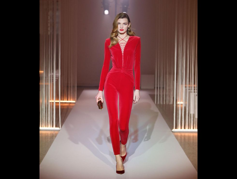 «Ho preso i miei 20 anni di carriera e in passerella c’è un’esplosione della mia femminilità. La sicurezza delle donne che vesto oggi la rappresento in colori scoppiettanti, nero, verde smeraldo e red velvet che finisce anche sulle labbra. Molti pezzi icona. Ho giocato con i gioielli, un luccichio molto forte, con rasi, velluti, la sensualità indossata».