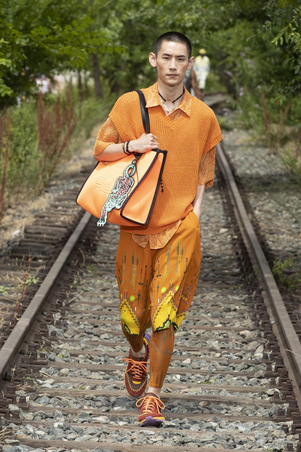 Si parla di musica anche da MSGM di Massimo Giorgetti. Canone infinito è il titolo del brano di Lorenzo Senni, soundtrack del progetto, «romagnolo come me, un romantico compositore underground», dice Giorgetti, che diventa l'atmosfera dell'intera collezione, di un racconto che segue i momenti di una lunga giornata, su una spiaggia deserta. Il video della collezione è stato girato in una baia della Maremma, «due giorni molto belli». Le fotografie di Stephen Milner ispirano i codici estetici: stile 90s, ragazzi in tuta da surf e capelli ossigenati, tra onde azzurre e tramonti infuocati. Arancio intenso e albicocca, nero assoluto e blu inchiostro, giallo, verde e un tocco di fluo sono le tinte dei capi per ragazzi che si riprendono in mano la vita dopo tanta mancanza di libertà. I lavaggi artisanal e le stampe acquerello, le tinture solarizzate, quasi un nuovo tie dye, creano effetti sorprendenti sui capi, come fossero lasciati a stingere sotto il calore del sole.