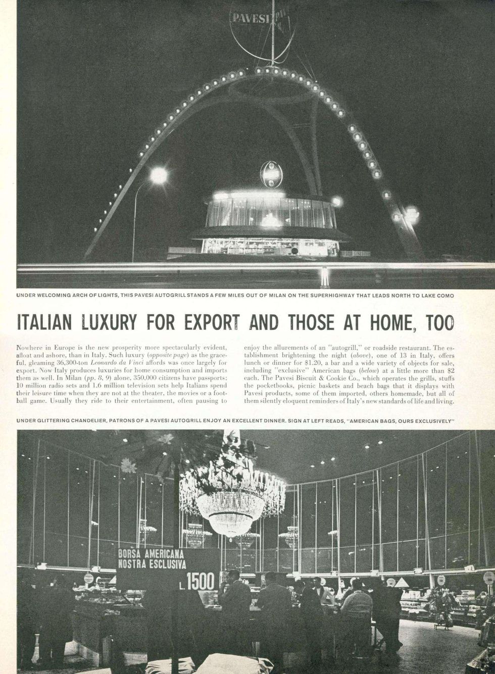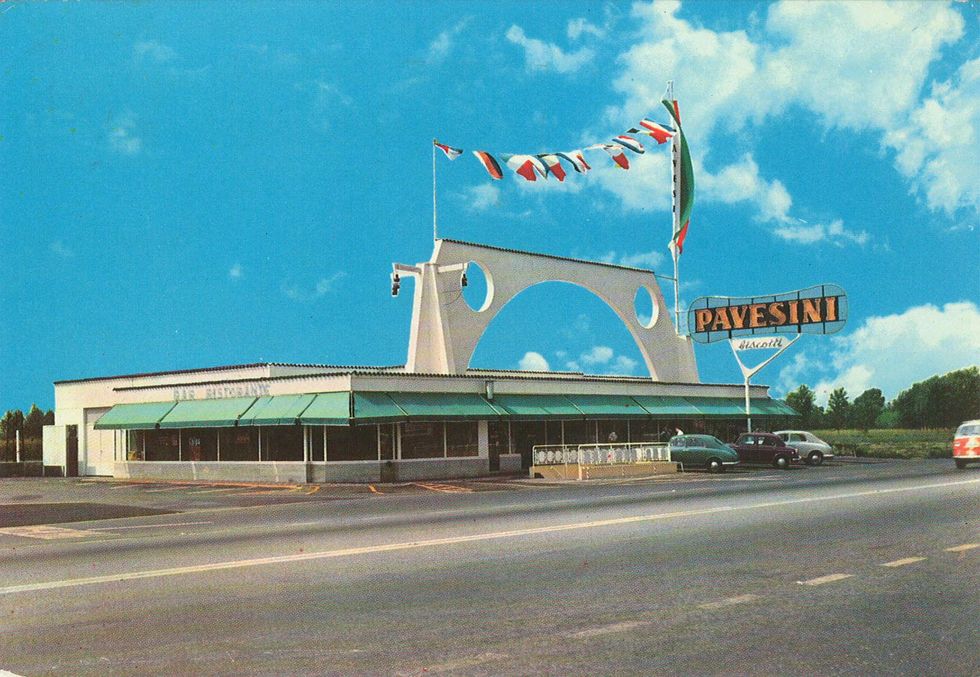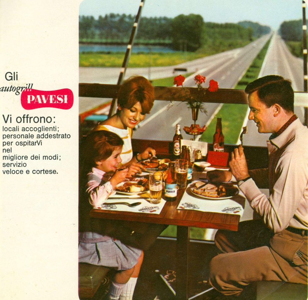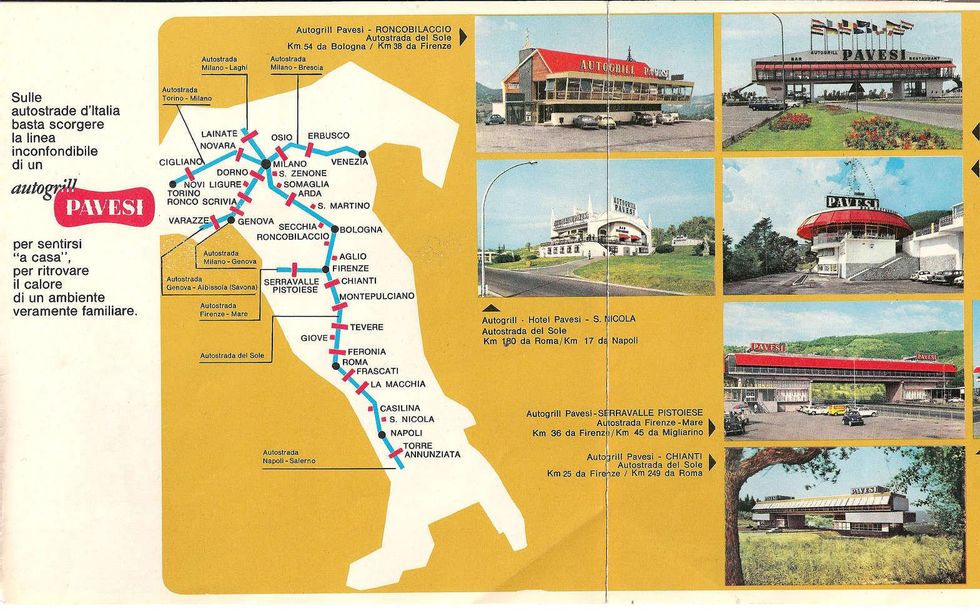 «La ragazza dietro al banco mescolava/ birra chiara e Seven-up/ e il sorriso da fossette e denti/ era da pubblicita' /come i visi alle pareti /di quel piccolo autogrill/ mentre i sogni miei segreti/ li rombavano via i TIR.» Fu proprio in un Autogrill lungo l'autostrada che Francesco Guccini ambientò la storia di un amore fugace e sfumato per una barista «bionda senza averne l’aria». E le pareti tappezzate di manifesti pubblicitari, le tendine in nylon rosa, il juke box, le insegne al neon riportano chi ascolta quella ballata malinconica ad uno dei luoghi simbolo dell’imprenditoria italiana dal boom economico in poi. La storia della prima catena italiana di ristorazione lungo la rete autostradale ai suoi albori ebbe inizio dal genio imprenditoriale di un industriale dolciario di Novara, Mario Pavesi.