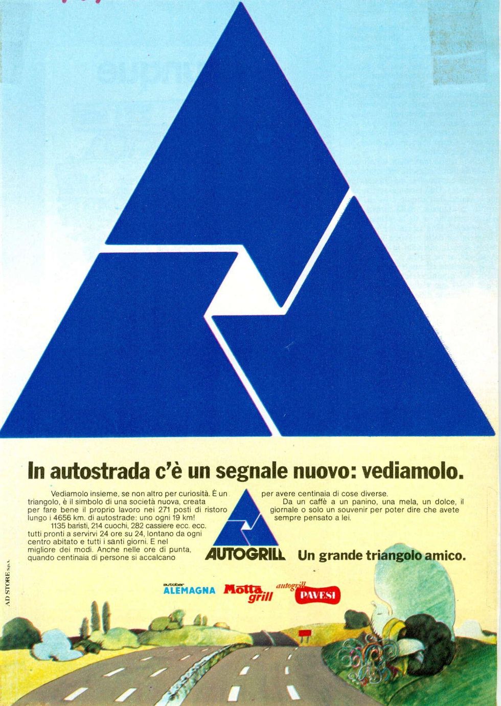 La storia di Mario Pavesi alla guida della grande catena si interruppe nel 1972 quando, afflitto dalle prime avvisaglie di una grave malattia che lo porterà alla morte nel 1990, decise di cedere alla Montedison il business di Autogrill esautorando i figli ancora troppo giovani dalla successione (si occuperanno in seguito degli altri marchi del gruppo). Il fondatore rimarrà presidente fino al 1974 e tre anni dopo, come era già accaduto ai concorrenti Motta e Alemagna, gli autogrill Pavesi furono inglobati assieme ai primi due marchi nel gruppo statale Sme, ramo alimentare dell’Iri, acquisendo la definitiva denominazione societaria «Autogrill». Sotto la gestione pubblica Autogrill inizia la lunga fase di espansione sia in Italia che all’estero. Degli anni Ottanta sono i brand della ristorazione espressa «Ciao» e «Spizzico», che ebbero una certa diffusione non solo in ambito autostradale nell’Italia che scopriva il mondo del fast food. I nuovi ristoranti furono aperti anche nelle principali città italiane e negli scali aeroportuali. Proprio la ristorazione aerea e il settore delle vendite in regime di porto franco duty free saranno gli obiettivi della società nel decennio successivo, caratterizzato nella prima metà da un’altra rivoluzione societaria per il marchio Autogrill. Nel 1993 l’Iri guidata per la seconda volta da Romano Prodi procedette allo smembramento e alla privatizzazione della Sme. Dopo un periodo in cui le offerte di diverse realtà bancarie e industriali furono ritenute inadeguate, il Gruppo comprendente Autogrill e la catena di supermercati Gs fu venduto ad una cordata costituita dalla famiglia Benetton e dall’altro grande imprenditore del nordest, Leonardo Del Vecchio. All’epoca della privatizzazione Autogrill aveva una rete di 311 punti vendita, quasi 6.500 addetti e un margine operativo lordo di 119 miliardi di lire. Sotto la gestione Benetton (Edizione Holding) l’azienda fu quotata in borsa nel 1997 e proseguì la forte espansione all’estero mediante importanti acquisizioni, sopra tutte quella del colosso della ristorazione aeroportuale statunitense HMS che deteneva il monopolio del franchising autostradale di importanti fast food come Burger King, Pizza Hut e altri. In Italia il marchio Burger King fu rappresentato proprio da Autogrill. Negli anni 2000 aumentò la presenza internazionale della partecipata dei Benetton nel business delle vendite aeroportuali esentasse, scisse nel decennio successivo dal ramo ristorazione con la nascita di World Duty Free con sede a Novara (esattamente dove nacquero gli autogrill di Pavesi), società quotata e in seguito interessata da un Opa della svizzera Dufry nel 2015 che ne ha acquisito la proprietà. La stessa società con sede a Basilea ha ripetuto l’operazione con l’acquisizione di Autogrill dai Benetton (rimasti possessori del 20% del pacchetto azionario), che determinerà di fatto la fine dell’italianità di quell’azienda che per quasi 80 anni ha nutrito i viaggiatori lungo tutta la rete autostradale e aeroportuale della penisola, facendo di Autogrill uno dei simboli più evocativi del miracolo economico del dopoguerra.