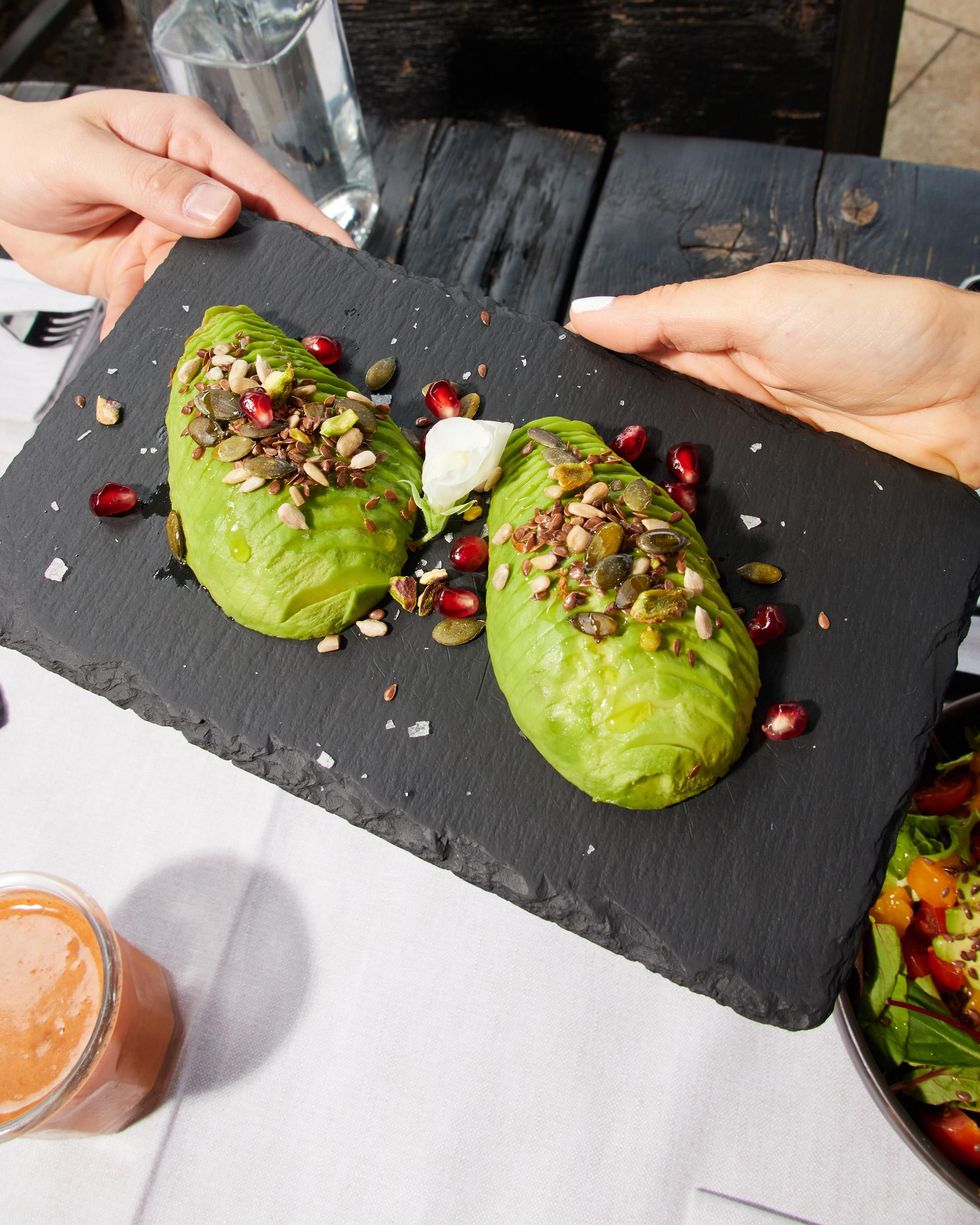 Week.Menu Brunch Veggie (7-8 maggio) (40€): avocado slice affettato e condito, con semi misti e melograno; Asian Bowl con wok di verdure al tamari, riso rosso, funghi shitake, tofu artigianale e pak choi, topping di salsa al sesamo e miso; chocolate slice a base di cioccolato e burro di arachidi, con gelato gusto vaniglia; succo a scelta.