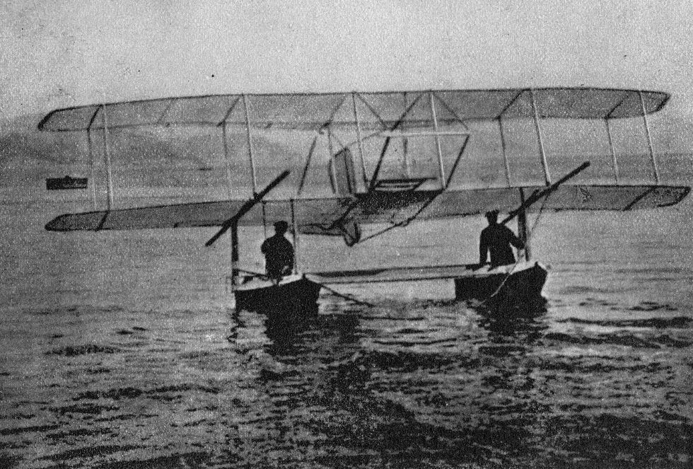 Nel cielo di Centocelle Wilbur Wright rese concreto il sogno del volo di fronte a centinaia di testimoni estasiati. Non soltanto il pilota americano volteggiò a lungo sulle teste degli spettatori senza incidenti, ma effettuò alcuni voli con passeggero. Tra i primi fortunati a provare l’ebbrezza del Flyer vi furono il principe Scipione Borghese, l’onorevole Sidney Sonnino, alcuni ufficiali dell’esercito e qualche nobildonna in crinoline. A terra, un giovane ufficiale di Marina sembrava avere più confidenza di altri con Wilbur Wright. I due si erano conosciuti per corrispondenza quando ancora flebile era l’eco delle magnifiche imprese del volo dei due fratelli dell’Ohio. Il Tenente di Vascello Mario Calderara, allora trentenne in forza alla Regia Marina, veronese di nascita e figlio di un ufficiale degli Alpini era sempre stato attirato dalla vita del mare e scelse la carriera sulle navi militari. Studiò a lungo, da ragazzo, il volo degli uccelli marini mentre si libravano nell’aria e planavano sfruttando le leggi della fisica. Saputa la notizia del successo dei fratelli Orville e Wilbur Wright nel 1905, intrattenne con loro una corrispondenza continua che portò i suoi frutti molto presto. Due anni più tardi, nelle acque di fonte a La Spezia, si vide levarsi in volo un aliante biplano simile per struttura al Flyer dei Wright ma con un paio di galleggianti al posto dei pattini e senza motore. Veniva trainato dal cacciatorpediniere “Lanciere” vincolato ad un cavo. Calderara lo portò in volo per un totale di circa 60 ore fino a quando un ammaraggio violento fece rischiare la vita al suo pilota, raccolto semi annegato. Nel 1908 era a Centocelle con Delagrange e conobbe uno dei primi costruttori di aeroplani in Europa, il francese Gabriel Voisin. Fu presso la sua officina di Issy Les Molinaux (periferia di Parigi) che Calderara ottenne di trasferirsi per un semestre per apprendere le tecniche della costruzione degli aeroplani. Un mecenate della capitale francese, Ambroise Goupy, finanziò il primo progetto di Calderara. Nacque così il biplano Goupy Calderara, che volò con successo nel marzo 1909 e che fu il primo apparecchio dotato di elica trattiva Tornato in Italia, incontrò Wilbur Wright nell’aprile 1909 durante i voli dimostrativi. Il pioniere americano lo riconobbe come il suo allievo ufficiale, anche perché Calderara era l’unico italiano ad avere avuto esperienza di volo e ad aver costruito una macchina volante efficace. Fu l’Aeroclub d’Italia a ratificare il primo brevetto di pilota di aeroplani in Italia, con i dati di Mario Calderara. Il biplano Flyer fu acquistato e rimase a Roma dove il pilota della Marina iniziò a insegnare i segreti del volo. Il 6 maggio durante una giornata particolarmente ventosa il Flyer precipitò e Calderara rischiò nuovamente la vita. Ma l’incidente non tolse il primo aviatore certificato dai comandi. Nel cielo di Brescia si tenne il primo Circuito aereo italiano, una gara sportiva tra i primi piloti del mondo. Dall’8 al 20 settembre 1909 Mario Calderara fu tra i partecipanti (in prevalenza francesi e inglesi) e riuscì a conquistare il primato della distanza, mentre primo assoluto fu il britannico Curtiss. Il biplano Flyer con motore potenziato pilotato da Calderara fu ammirato nelle sue evoluzioni da Vittorio Emanuele III. La presenza del Re fu il miglior viatico per la causa della nascita dell’aviazione italiana, che appena due anni più tardi, nella guerra di Libia, ebbe il battesimo del fuoco. Da un aereo italiano, quello pilotato dal Capitano Riccardo Moizo, caddero bombe a mano su un villaggio libico. Era il primo bombardamento aereo del mondo.