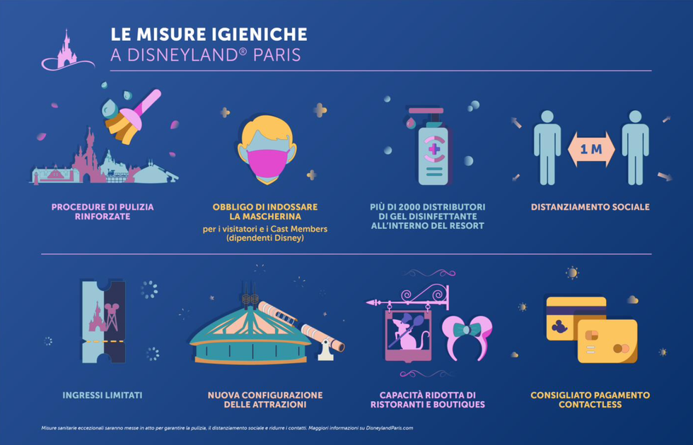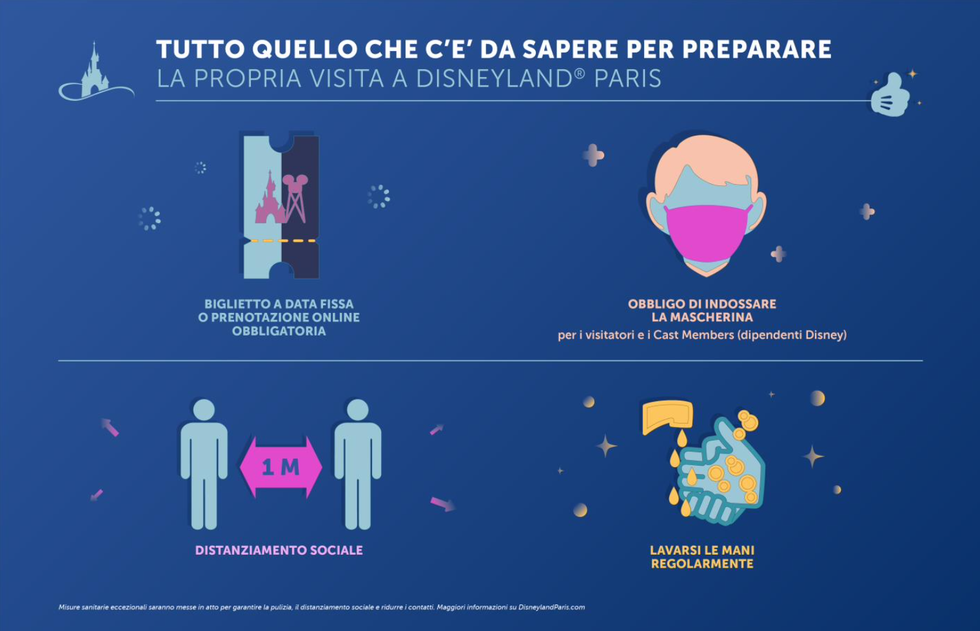 Tra le regole essenziali del parco, che vivrà una seconda vita dal prossimo mercoledì, quella di igienizzare le mani prima e dopo ogni attrazione e l'impossibilità - dettata dalle norme di sicurezza di prevenzione dei Covid-19 - di abbracciare o interagire personalmente con i personaggi al parco. Minnie, Topolino, Paperino, principi e principesse saranno comunque presenti all'interno del resort e accoglieranno gli ospiti in nuove location denominate «selfie spot» in cui sarà possibile scattare una foto ricordo con loro senza tuttavia avvicinarli.