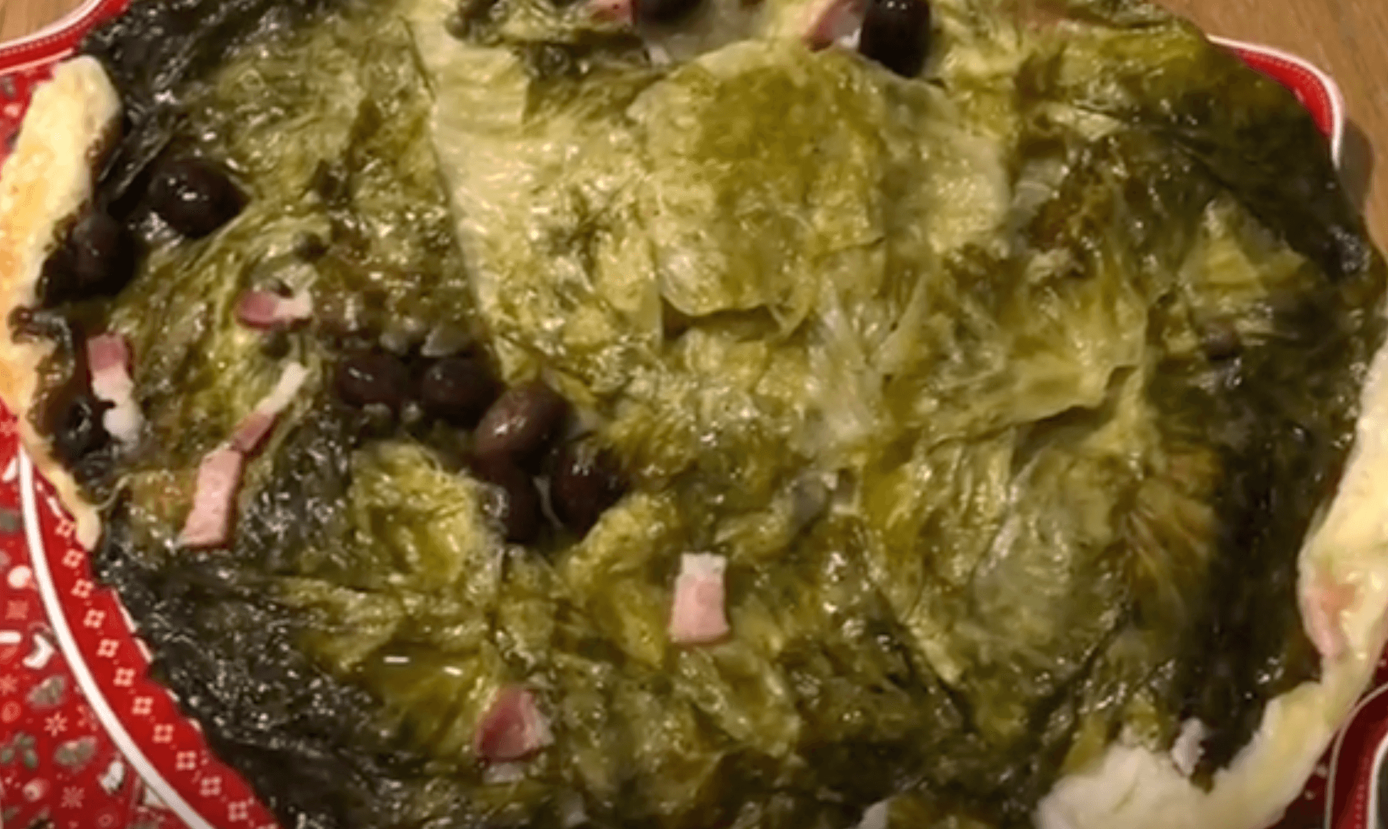 Ingredienti - Un cespo d’insalata scarola bella croccante, cento grammi di pancetta o bacon in tre o quattro fette spesse da cui ricavare dei dadini, 80 gr di olive taggiasche denocciolate, 30 gr di capperi dissalati, una confezione di pasta sfoglia (o se preferite brisé), sale, pepe olio extravergine di oliva qb.