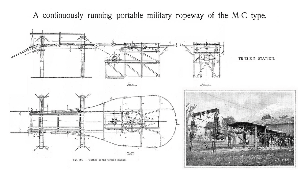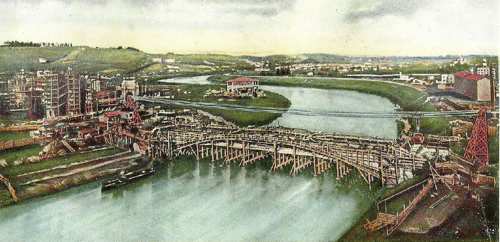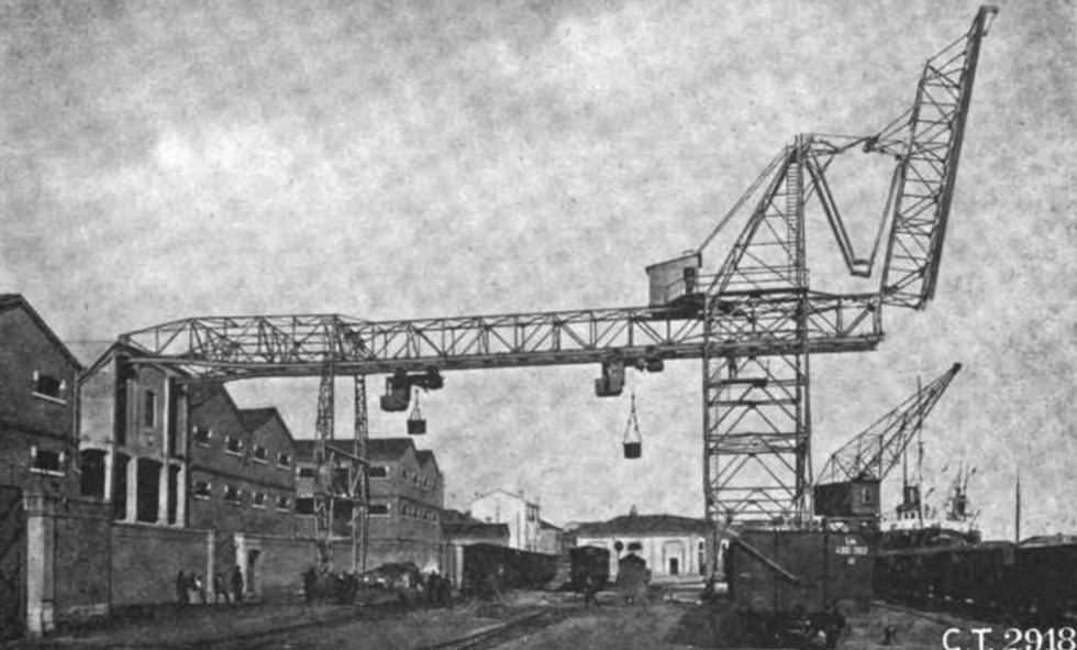 Negli stessi anni l’applicazione del trasporto aereo su fune fu sviluppata dalla azienda della Bovisa in più forme e declinazioni, rendendo protagonista nel mondo della movimentazione merci l’azienda di Milano. Dalle funicolari e teleferiche derivarono i grandi macchinari automatizzati per il sollevamento, il movimento e lo stoccaggio delle merci nei porti, nelle miniere, nei grandi cantieri e nelle fabbriche. Già nei primi anni del secolo XX la Ceretti&Tanfani stabilì un record nella realizzazione per conto di una società londinese. Nel 1907 realizzò una teleferica per il trasporto del marmo che subito fissò un record mondiale. Si trattava di un impianto in grado di trasportare carichi pesantissimi, dapprima da 7 quindi da 20 tonnellate a carico, installata nella valle detta del «balzone» nel comune di Fivizzano (Massa Carrara). Allo scoppio della Grande Guerra l’azienda milanese fu in prima linea con la fornitura di teleferiche per il Genio militare, concepite per essere facilmente trasportate e montate, che furono utilizzate su tutti i fronti della guerra bianca. Grande slancio, tra le due guerre, ebbe il settore del movimento merci per l’azienda milanese. La Ceretti&Tanfani portò nei grandi scali merci l’innovazione, in particolare nell’applicazione dell’automazione. Una delle prime realizzazioni fu a Venezia, nel bacino portuale di San Basilio, fu un innovativo impianto trasportatore per il carico delle navi, allora chiamato Telfer, che applicava la tecnica funiviaria alla logistica marittima. Il pontile in ferro, oscillante e regolabile secondo l’altezza delle navi, caricava automaticamente vagoncini su fune permettendo una velocizzazione delle operazioni di carico e una decisa economizzazione sulla necessità di mano d’opera. Questo tipo di impianto fu poi perfezionato e divenne uno dei prodotti di punta di Ceretti&Tanfani che, assieme alle gru di grande tonnellaggio, fu installato nei porti di tutto il mondo. La ditta milanese fu leader anche nella realizzazione dei blondins, impianti a fune per la costruzione di grandi opere come dighe o ponti. Si trattava di installazioni ibride costituite da una grande gru a pilone mobile a cui era collegata una linea aerea su cui correvano una o più benne per la movimentazione di grandi quantità di materiali per costruzione, nell’ordine delle tonnellate. Una delle prime installazioni di blondin fu quella utilizzata a Roma nel 1910 per la costruzione del primo ponte Flaminio sul Tevere, poi ricostruito nel 1938. Tra le due guerre e in seguito per i decenni della ricostruzione e del boom economico l’azienda della Bovisa, che occupava una grande area industriale del quartiere milanese, fu leader assoluta nella realizzazione di questo tipo di impianti che contribuirono alla crescita rapida delle grandi infrastrutture nel mondo. Blondins a marchio Ceretti&Tanfani furono in opera già nei primi anni Venti in Paesi lontani, come quello realizzato nel 1923 per la costruzione della diga di Durban, in Sudafrica.
