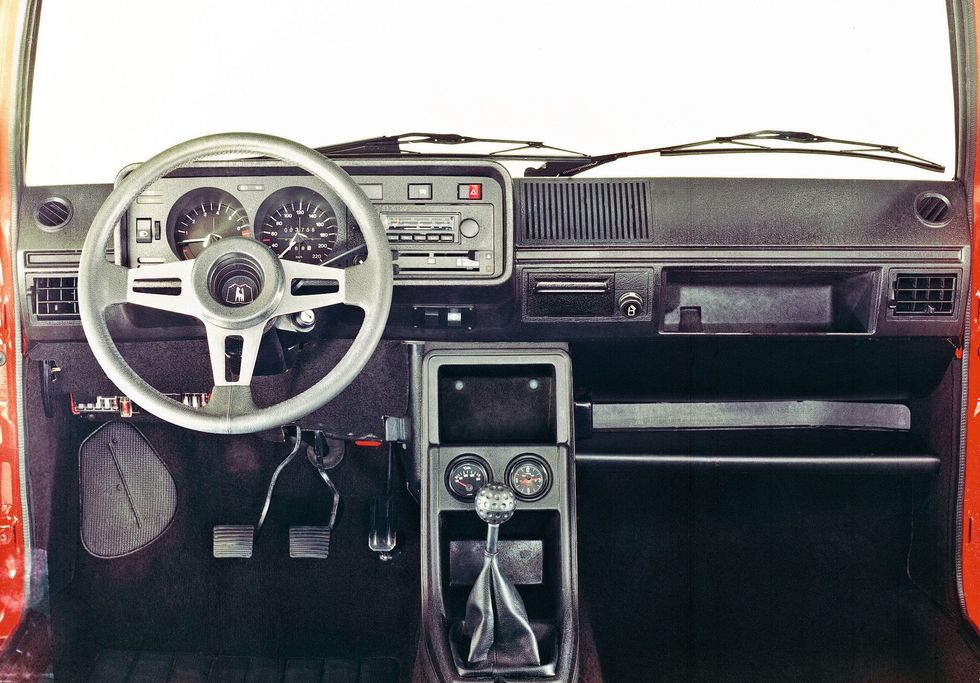 La Italdesign si occupò anche delle forme della Golf, terza novità presentata nel 1974, quando già gli effetti della crisi petrolifera avevano fatto tremare le grandi case automobilistiche mondiali. Le linee disegnate da Giugiaro interpretavano a pieno lo stile del decennio: spigolose, ma attenuate da un frontale filante e dai proiettori circolari. Ampie le vetrature, che garantivano una buona visibilità sia laterale che posteriore. La parte posteriore era invece caratterizzata da un elemento che avrebbe preso piede dagli anni Settanta in avanti, ossia il portellone posteriore che faceva della Golf una «tre o cinque porte» con una ottima accessibilità al bagagliaio, che con i sedili posteriori reclinati raddoppiava la già considerevole capacità di 350 litri. La prima Golf era proposta con due motorizzazioni: un 1.093 cc. da 50Cv e un 1.471 cc. da 70 Cv per una velocità massima rispettivamente di 140 e 160 km/h, nella media delle concorrenti dell’epoca. Anche i consumi, che oggi sarebbero considerati eccessivi, rientravano nei parametri post-shock petrolifero: 8 litri per 100 km la 1.1 e 8,5 litri per la 1.4, decisamente più brillante. Per entrambe le motorizzazioni era prevista l’unica trasmissione manuale a 4 marce. Il prezzo al pubblico, pur essendo una macchina di importazione, si affiancava in Italia a quello della concorrente Alfasud: circa 2 milioni di lire per la 1.100 base. Due gli allestimenti, uno più spartano e una versione lusso (L per la motorizzazione da 1,1 litri e LS per la 1,5 litri). Sin dal suo esordio, la Golf fu pubblicizzata dalla casa madre come una macchina economica soprattutto dal punto di vista della manutenzione. Sui giornali che ne annunciavano il lancio, fu sottolineato il fatto che la nuova Volkswagen necessitava di un «solo» cambio olio ogni 7.500 km e che i componenti di motore e carrozzeria erano facilmente sostituibili, riducendo così le ore di manodopera. Partì dunque in sordina, presentandosi come macchina per le famiglie e anticrisi, la storia di un’automobile che presto diventerà uno status symbol soprattutto tra i giovani per la sua vocazione aggressiva e sportiva. Ma quest’ultima arriverà soltanto con l’introduzione di nuove e più prestanti motorizzazioni. Era il 1975 quando l’ingegnere della Volkswagen Alfons Lowenberg concepì la Golf GTI, capostipite delle piccole «pepate» che invaderanno le strade del decennio successivo. Contrariamente a quanto si potrebbe immaginare, il progetto fu avversato dai vertici di Wolfsburg, concentrati sul fronte della crisi del periodo e sull’idea che il marchio VW si identificasse unicamente con auto «tranquille», mentre la vocazione sportiva era riservata prevalentemente a Porsche e Audi. Il gruppo di lavoro che sosteneva l’idea dell’ingegnere fece allora da sé, preparando il prototipo (inizialmente battezzato «Sport Golf») con i pezzi a disposizione in fabbrica, alcuni dei quali presi dalla «Scirocco» e altri dall’Audi 80 che furono assemblati durante le ore di pausa dall’attività quotidiana. Da quella sorta di «bricolage» meccanico nacque un piccolo mostro di potenza, nascosto dalla carrozzeria della Golf 3 porte, scelta perché più adatta all’impostazione sportiveggiante del progetto. Il propulsore era il cuore della Golf GTI. Il quattro cilindri da 1,6 litri (ancora all’epoca abbinato a un cambio a quattro rapporti) erogava la potenza di 110 Cv, che erogata spingeva la compatta tedesca oltre i 180 Km/h con accelerazione 0-100 in soli 9 secondi. La GTI si distingueva dalla produzione di serie per gli interni, con il volante sportivo a tre razze e gli strumenti aggiuntivi tipicamente rallye, i sedili con disegno tartan più avvolgenti e all’esterno presentava la caratteristica cornice rossa sulla calandra anteriore con la scritta GTI sul lato sinistro della griglia. Presentata al salone di Francoforte nel 1975, la GTI fu inizialmente presentata come una edizione limitata della Golf, in soli 5.000 esemplari. Fu lo strepitoso successo seguito alla fiera a spazzare via l’iniziale diffidenza dei vertici di Wolfsburg: dopo pochi mesi gli ordini superarono le 30mila unità e la GTI fu da allora prodotta in serie, diventando una della auto più desiderate dai giovani e non soltanto. Il traino della serie sportiva fece decollare le vendite, e fu grazie alla Golf che molti lavoratori della Volkswagen (tra cui molti italiani emigrati in Germania) evitarono il licenziamento dovuto agli effetti della grave crisi internazionale del settore auto. La prima serie fu prodotta dal 1974 al 1983 con un leggero restyling nel 1978, mentre già nel 1976 la Golf ebbe in listino una versione a gasolio, affiancata nel 1982 dalla prima turbodiesel GTD. Alla fine della carriera della prima serie nel 1983 erano stati prodotti 6.780.050 esemplari. La seconda serie fu una rivoluzione nello stile, che abbandonò le linee spigolose della precedente versione di Giugiaro per una linea più morbida disegnata dal tedesco Herbert Schaefer. La nuova golf ereditò i motori GTI e GTD, che nel frattempo erano stati aggiornati con aggiunta del propulsore da 1,8 litri e del cambio a 5 rapporti già con la prima serie. La seconda generazione portò diverse innovazioni soprattutto riguardo gli aspetti tecnici e meccanici. Per quanto riguarda la sportiva GTI, dal 1986 fu introdotto il propulsore da 1,8 litri 16 valvole, in grado di erogare 139 Cv. L’anno successivo vide l’introduzione della trazione integrale sulla Golf Syncro, la cui meccanica sarà ripresa nel 1990 dalla Country, una Golf dalla luce da terra simile a quella di un fuoristrada, vocazione richiamata anche dalla ruota di scorta sul portellone posteriore, anticipatrice degli attuali crossover. Non mancò una edizione speciale, la «cattivissima» G60 dotata di sovralimentazione turbo da 160 Cv.