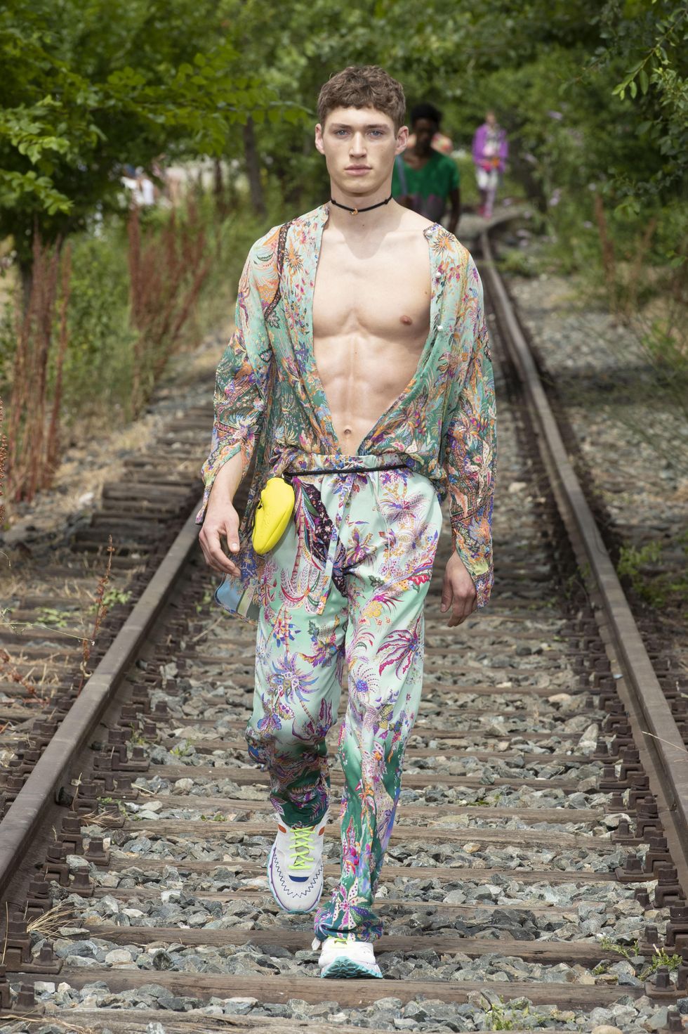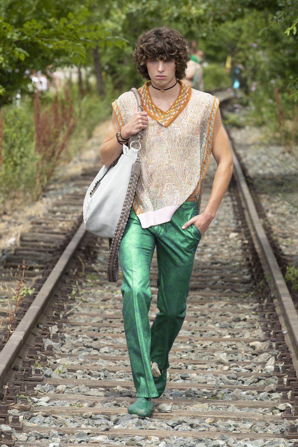 L'omaggio a Franco Battiato di Kean Etro è iniziato con la musica della sfilata Etro, una delle tre in presenza di tutta la fashion week milanese dedicata all'uomo, aperta con L'era del cinghiale bianco e finita con Cuccurucucu. Tutti cantavano sulle onde delle famose ed eterne canzoni del grande maestro siciliano. «Lo conobbi nel negozio di mia madre» racconta lo stilista. «Comperava tessuti antichi, era attratto da quelli persiani. In comune abbiamo il nomadismo, il nomadismo dell'anima». La presentazione allo Scalo Farini, luogo dismesso in attesa di una riconversione, dove i binari ormai senza meta, sono stati la passerella di bellissimi indossatori, indifferenti al caldo torrido. «Siamo in un luogo dove non c'è un inizio né una fine però tutto inizia là dove finisce». La collezione «ha uno spirito agrumato, vitaminico, energetico, ottimista. Il condensato di un sentire senza troppe regole e senza una dimensione di marketing» Tutto è gioia di vivere che Kean ha espresso in camicie in georgette impalpabili portate su pantaloni metallici in canvas spalmato, felpe in cady di seta, caftani. Si può essere certi che lei ruberà nell'armadio di lui pezzi di grande fascino ed emozionanti. E i Maneskin, vestiti Etro sia a Sanremo che all'Eurofestival? «Con i ragazzi ci siamo messi a galoppare in una nuova direzione. Rock che fa parte di noi, rock metafisico».