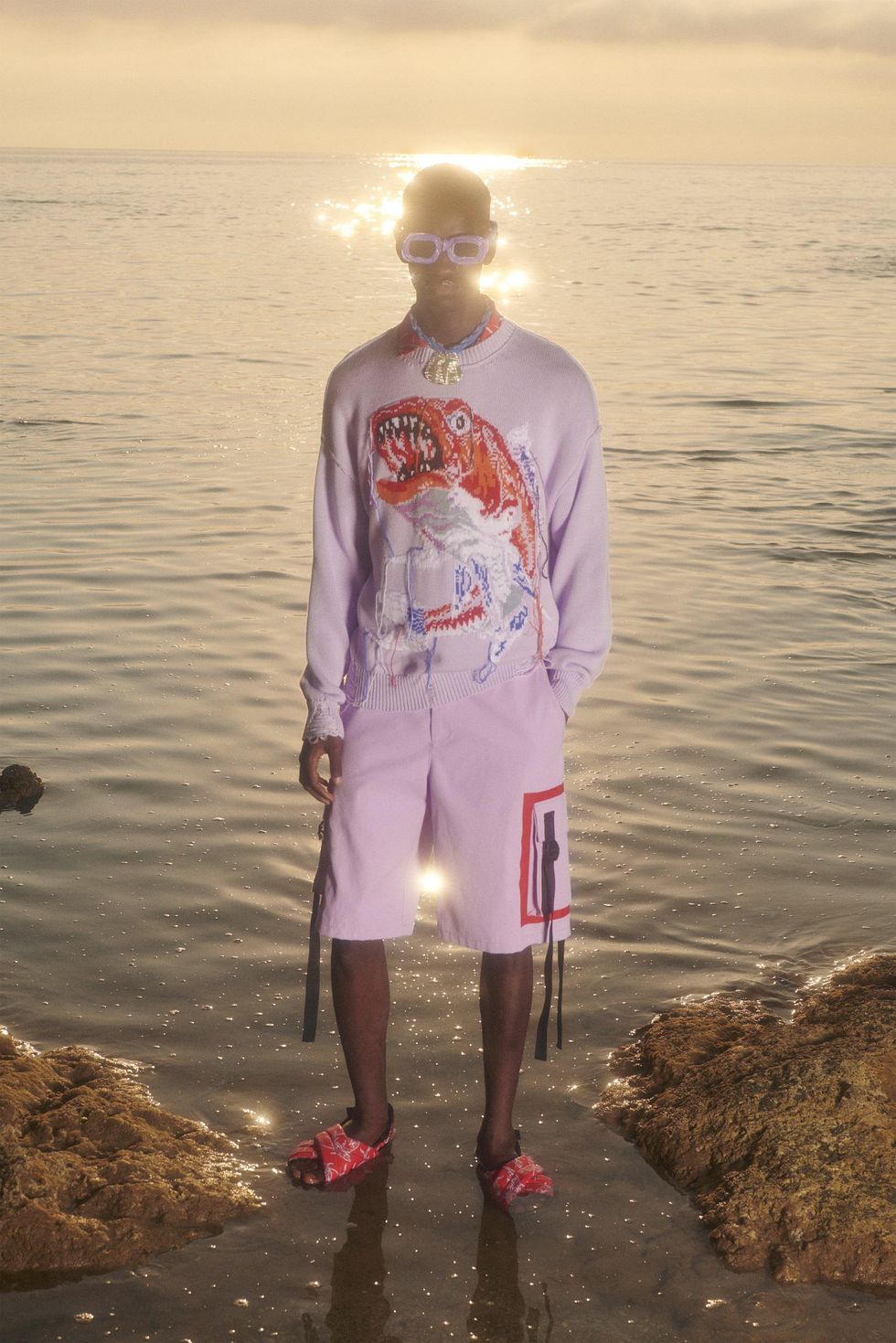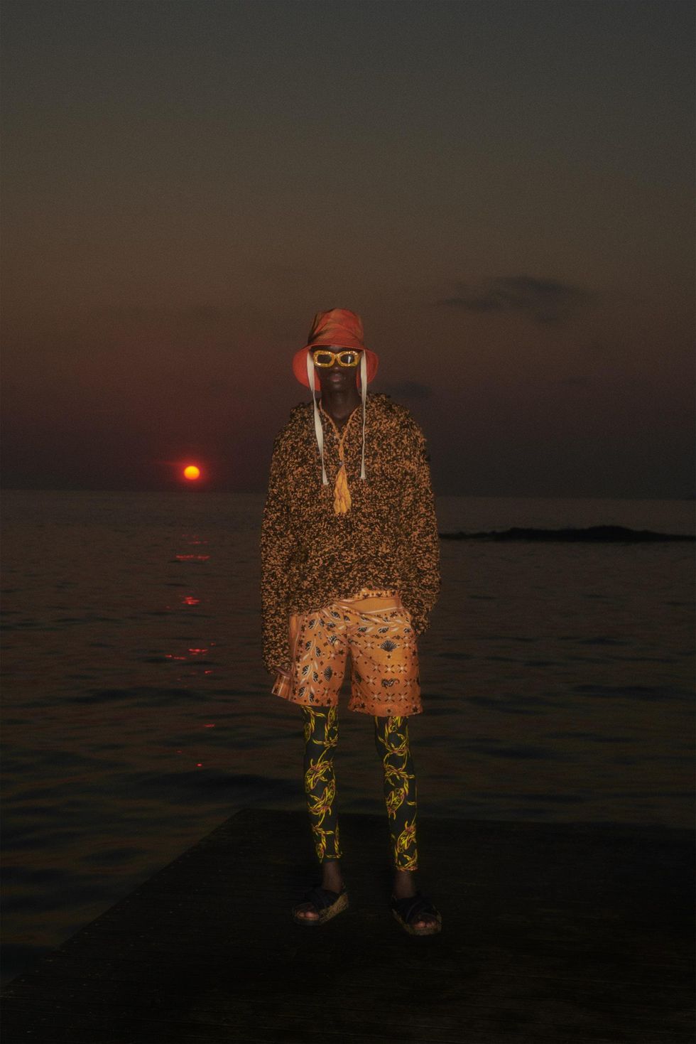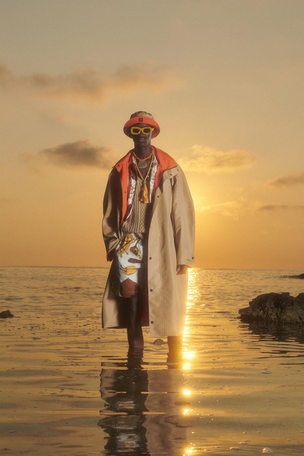 Si parla di musica anche da MSGM di Massimo Giorgetti. Canone infinito è il titolo del brano di Lorenzo Senni, soundtrack del progetto, «romagnolo come me, un romantico compositore underground», dice Giorgetti, che diventa l'atmosfera dell'intera collezione, di un racconto che segue i momenti di una lunga giornata, su una spiaggia deserta. Il video della collezione è stato girato in una baia della Maremma, «due giorni molto belli». Le fotografie di Stephen Milner ispirano i codici estetici: stile 90s, ragazzi in tuta da surf e capelli ossigenati, tra onde azzurre e tramonti infuocati. Arancio intenso e albicocca, nero assoluto e blu inchiostro, giallo, verde e un tocco di fluo sono le tinte dei capi per ragazzi che si riprendono in mano la vita dopo tanta mancanza di libertà. I lavaggi artisanal e le stampe acquerello, le tinture solarizzate, quasi un nuovo tie dye, creano effetti sorprendenti sui capi, come fossero lasciati a stingere sotto il calore del sole.