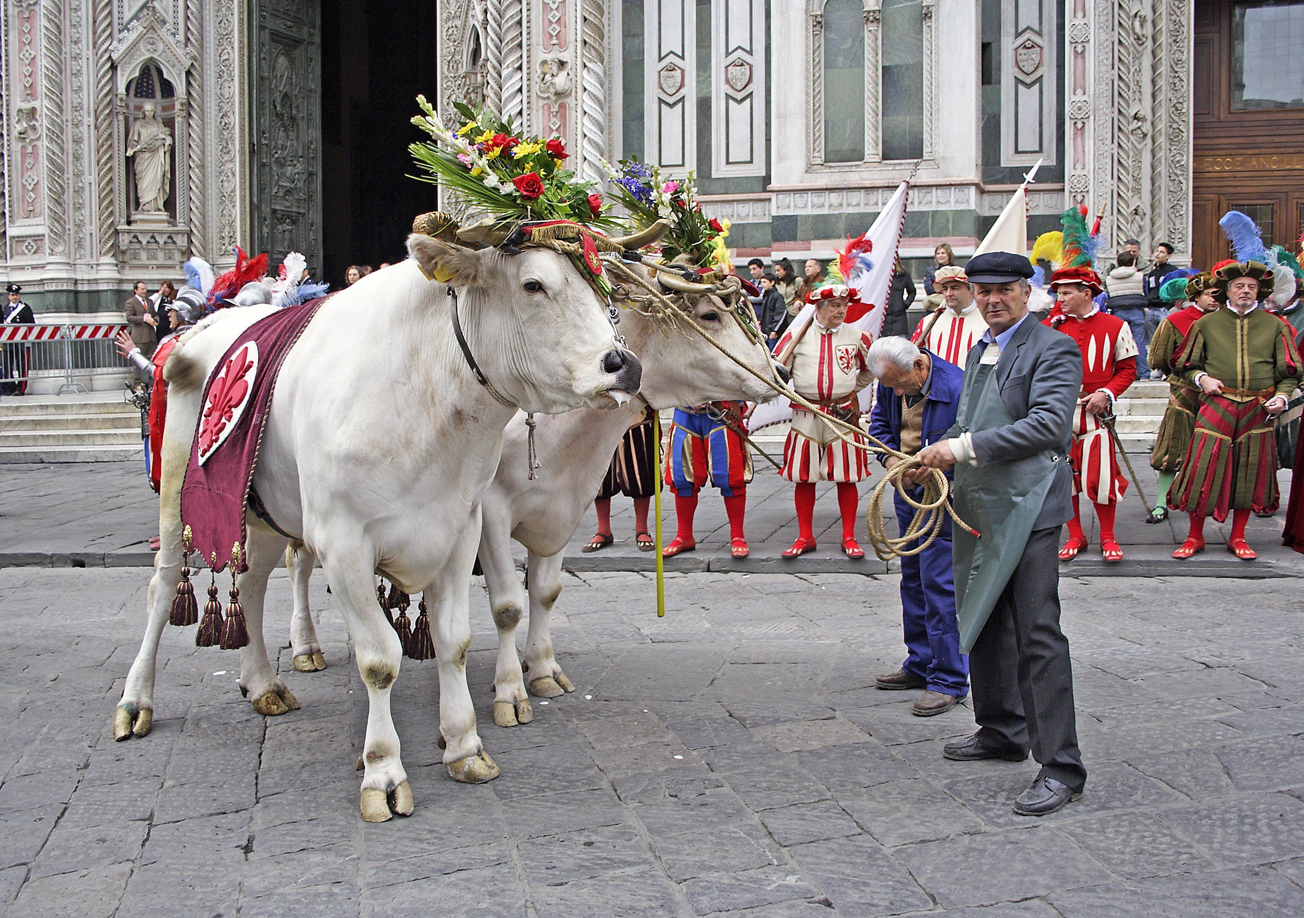 Ma spieghiamoci meglio: alla fine della messa pasquale, l’arcivescovo accende sull’altare un razzo a forma di colomba. Questo – attraverso un meccanismo a fune – attraversa la navata centrale, raggiungendo infine il carro che, trainato da dei buoi, viene posizionato tra la cattedrale e il battistero.