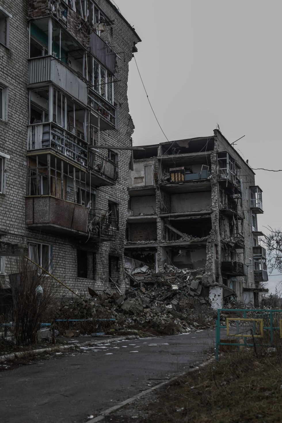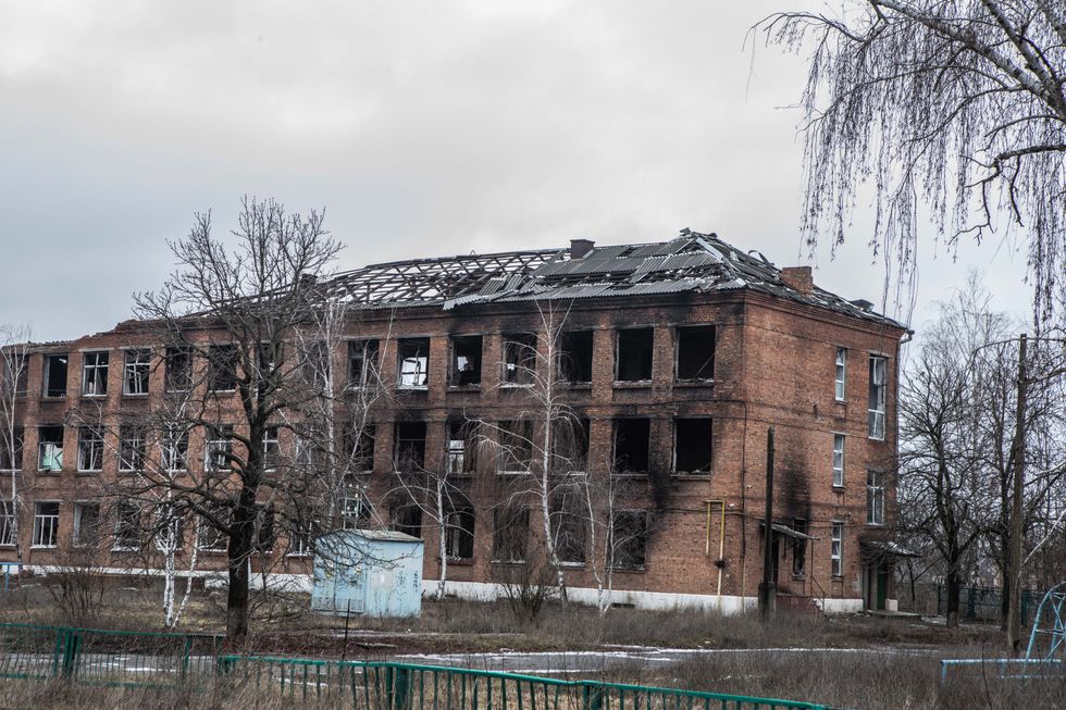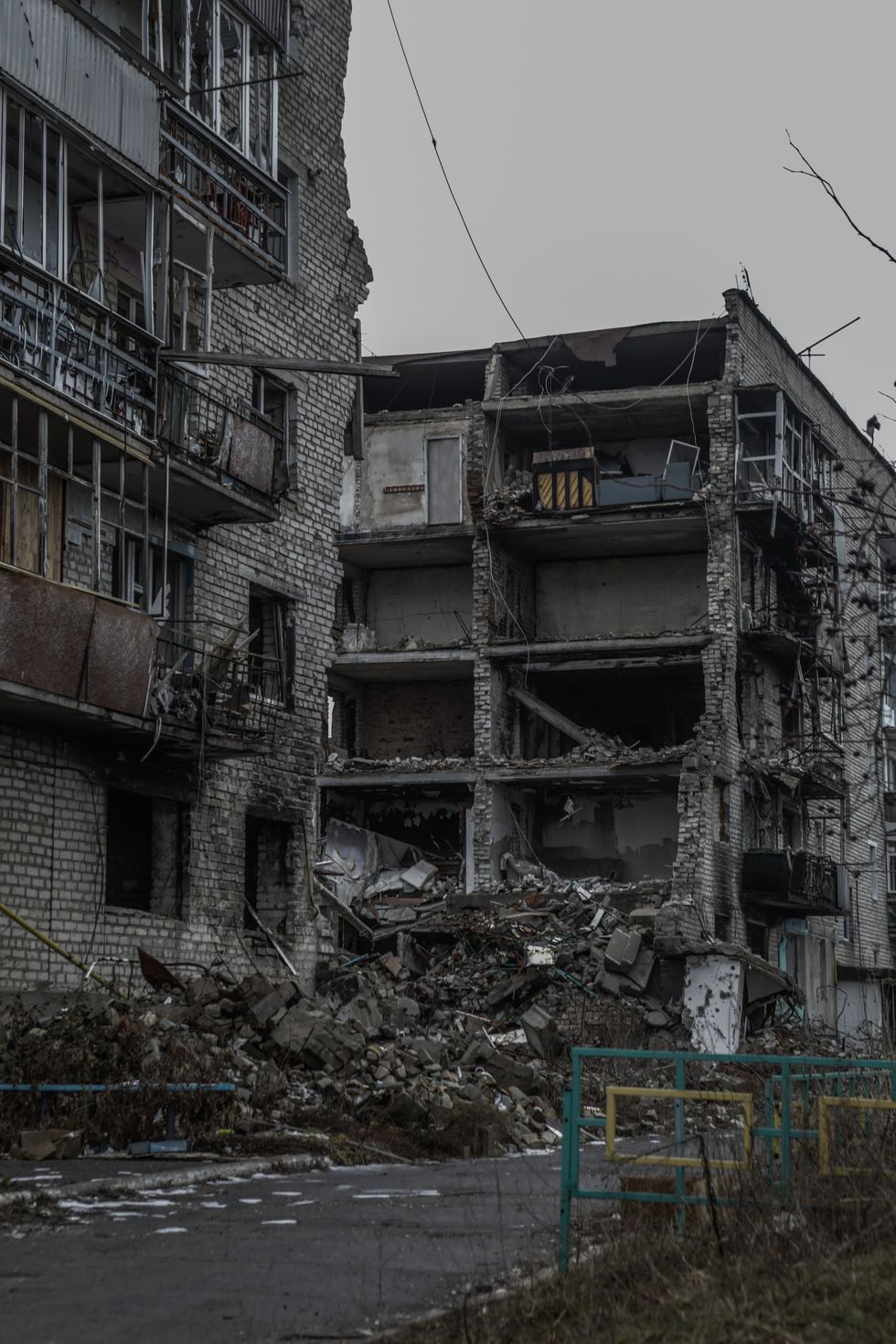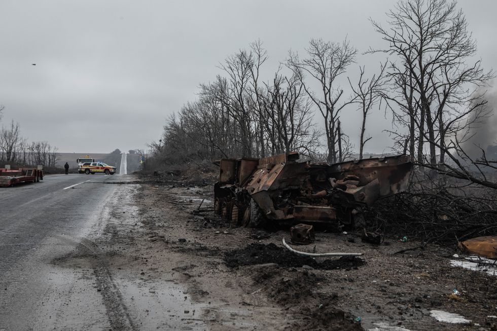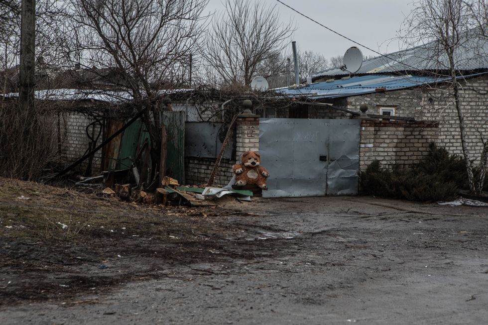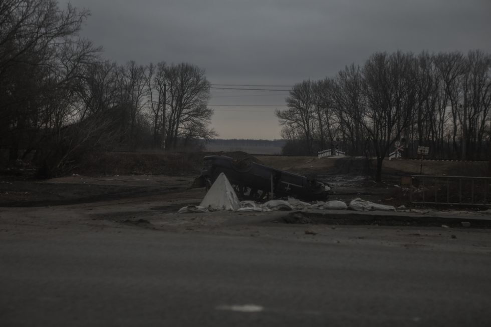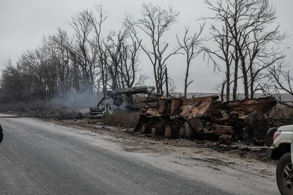 A circa due ore da Kramatorsk, passata la martoriata città di Izyum, inizia gradualmente a presentarsi lungo la strada uno scenario spettrale. La carreggiata attraversa le campagne scendendo e salendo da dolci colline, nei campi intorno si vedono i primi carri armati distrutti, sparsi nei campi come relitti sul fondo marino. Gli autogrill e i vecchi check point negli incroci principali mostrano i chiari segni di un durissimo scontro, più in là poi iniziano a esserci i primi villaggi, con i palazzi divisi in due dai missili, le lamiere dei tetti sparse a brandelli tutto intorno, come pezzi di stoffa atterrati dopo le esplosioni spargendosi dolcemente sul terreno. C’è ancora un odore acre eppure sono passati mesi da quando qui (e lo si può capire dalla posizione dei resti dei carri armati) c’è stata una battaglia in campo aperto, nella quale i carri si sparavano direttamente: da una parte della strada i carri russi, dall’altra i carri ucraini ormai tutti arrugginiti.